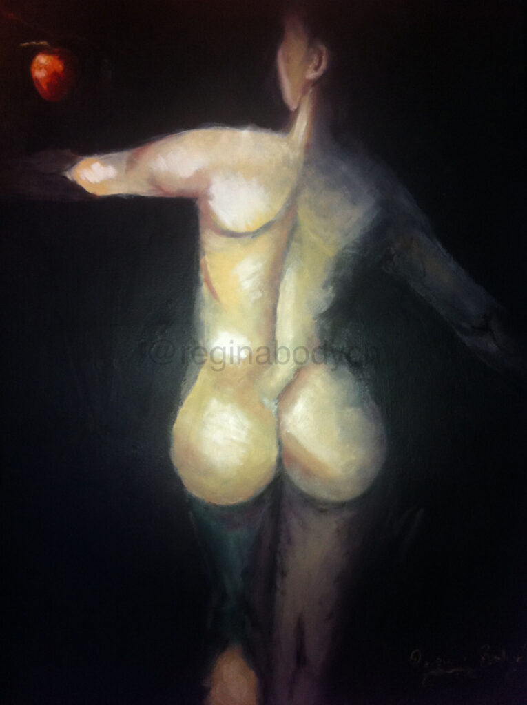 In Eve, the artist depicts the first woman as a symbol of strength, vulnerability, and the timeless burdens of womanhood. Facing away, Eve reaches for a glowing red apple—representing knowledge, temptation, and choice. The dark background emphasizes her solitude, while soft light highlights her natural beauty and resilience. Through this portrayal, Eve becomes a powerful symbol of the struggles and courage inherent in feminine identity since the beginning of time.