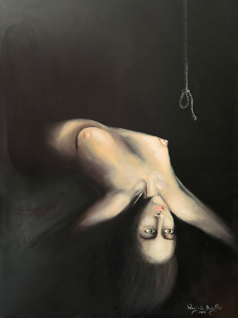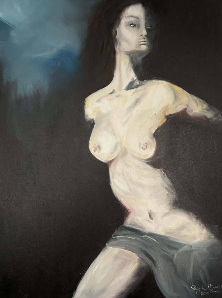 The Dark Age series is a powerful, introspective exploration of the enduring struggles faced by women across different eras. Through four oil paintings, each depicting a nude female figure in solitude, this series confronts themes of vulnerability, resilience, and the cyclical nature of oppression and empowerment. The figures stand against dark, somber backgrounds, which lend a sense of isolation and intensity to each scene, drawing the viewer into a timeless, almost haunting atmosphere.
