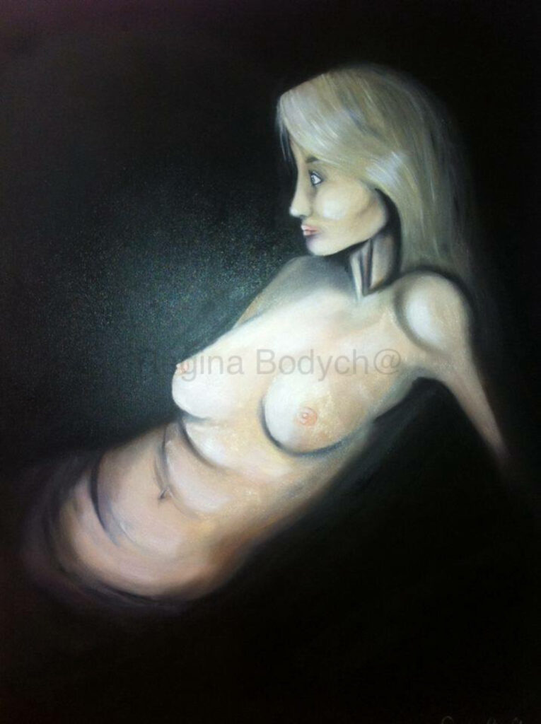 In Roza, the artist presents a solitary, nude woman seated against a dark, shadowy background, capturing a moment of introspection and vulnerability. Her figure is softly illuminated, creating a gentle contrast with the darkness that envelops her. The subtle play of light and shadow highlights the contours of her body, emphasizing both her natural form and her quiet strength.